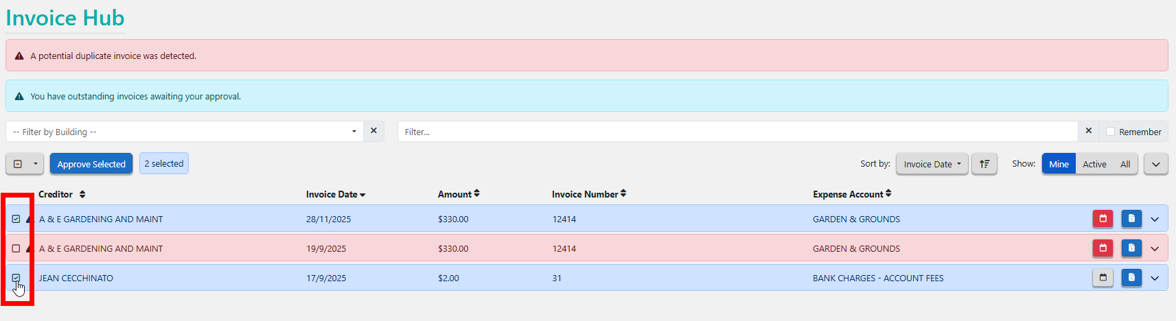After selecting the invoices to approve by either ticking the checkbox or clicking anywhere on an invoice line; click on the Approve Selected button.